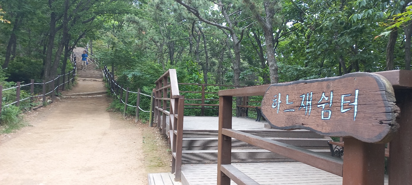 나는 계양산을 갈 때는 계양역 4번 출구로 나가서 약 5분 정도 인도로 걸어가다 우측 계양산 방향으로 가면 주차장과 계양산관리사무소가 나온다. 여기서 시작하여 계단으로 턱에 숨이 차 오를 때쯤이면 요기 하느재쉼터에 도착한다.
