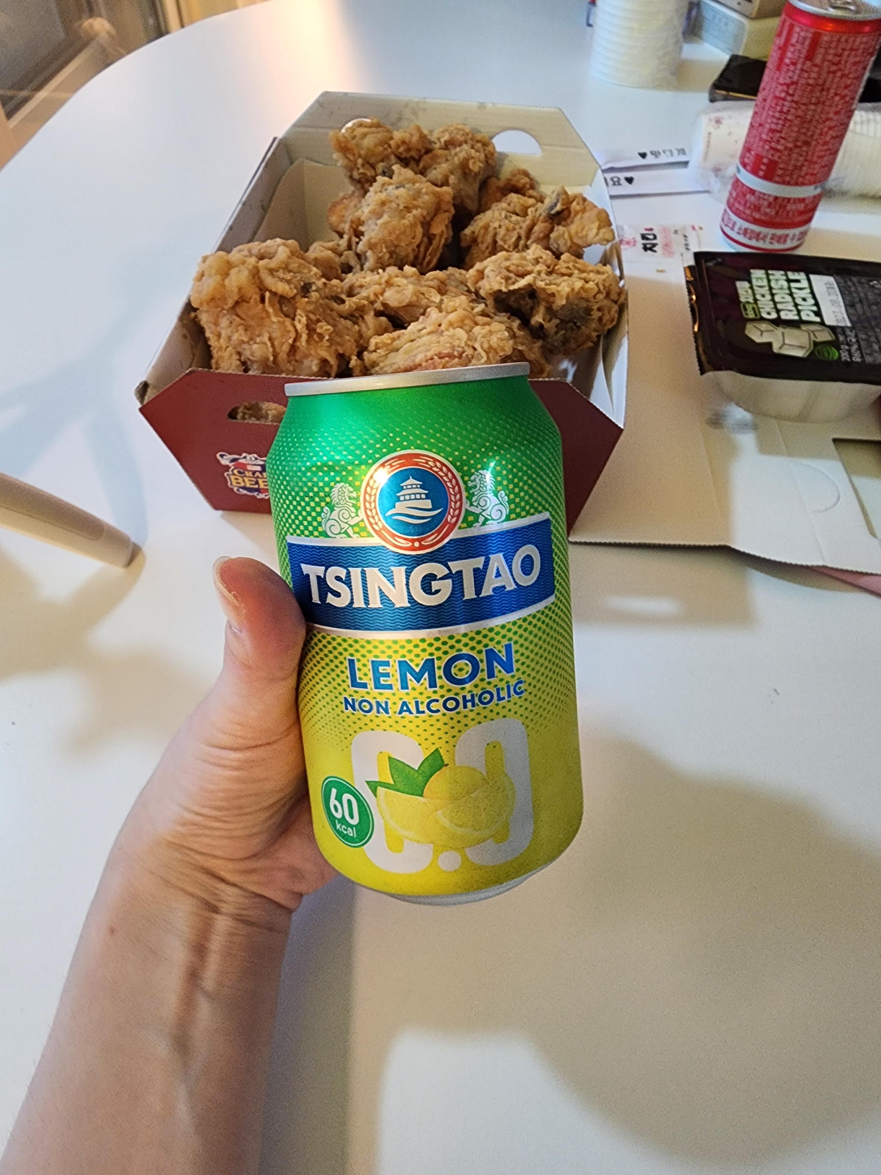 살짝 수영을 하다가 태풍 경보로 해수욕장이 일찍 닫았어요.. 그래서 숙소로 돌아와서 간단하게 치킨과 함께 술 한잔 했어요! 저는 금주 중이라 무알콜맥주로..!