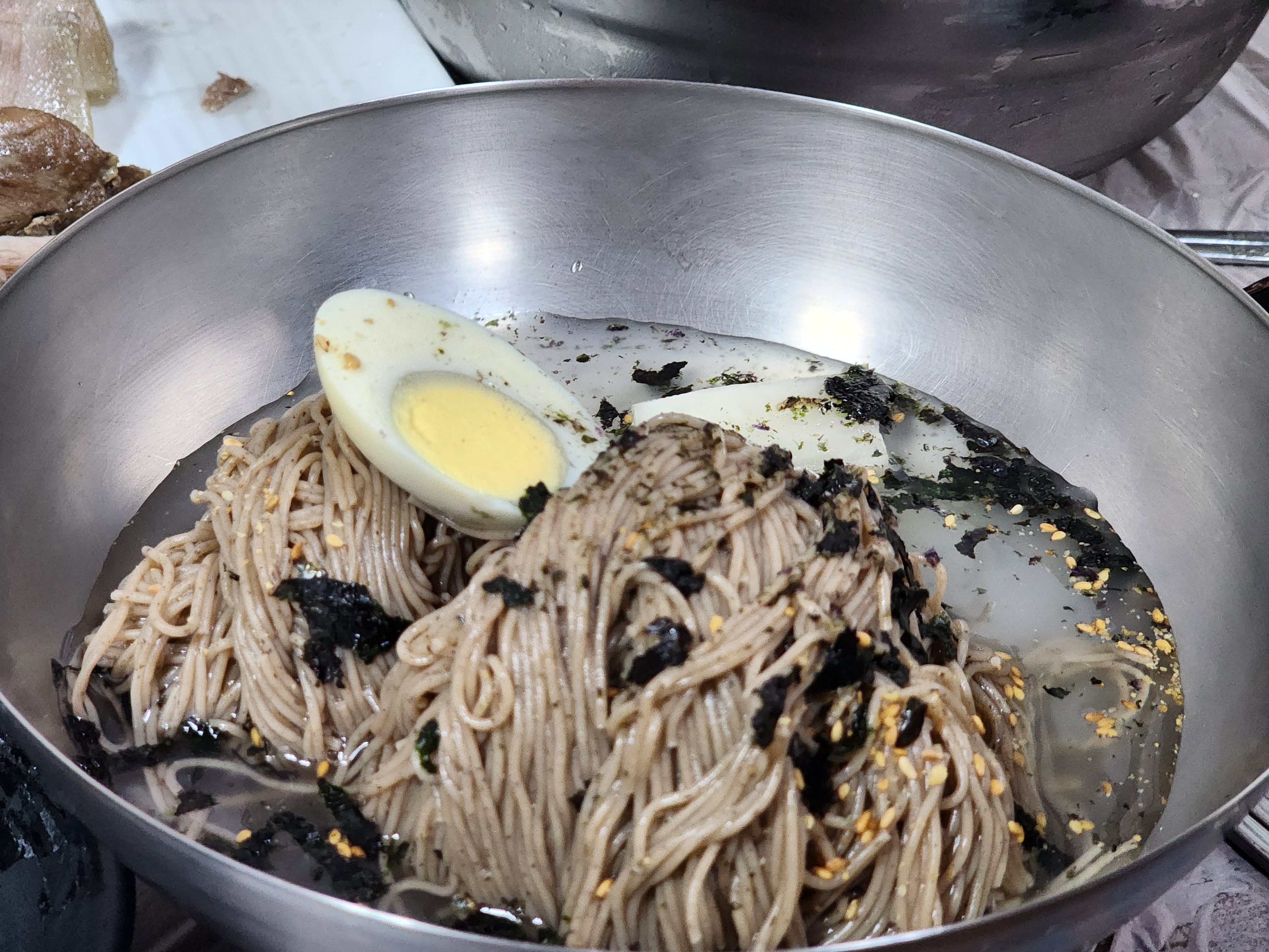 막국수 집 앞에 천막 크게 쳐져있어서 대기 장소가 마련되어있더라고요. 화장실 바로 앞.. 모기가 너무 많다.. 차에서 기다리다가 어플로 대기번호 3번정도 되면 올라오세요! 저희도 귀찮아서 여기서 기다렸는데 그냥 차에서 시원하게 에어컨 틀어놓고 기다릴걸 그랬어요....