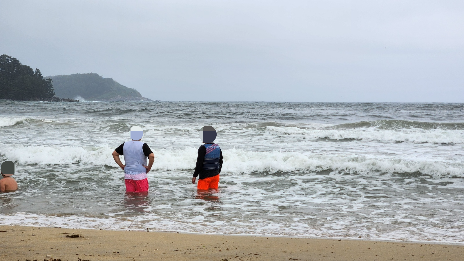 경보문자 계속 올만한게 풍랑이 장난아니었어요.. 파도가 무섭고 물이 흙탕물이 되어버림.. 그래도 비 맞으면서 해수욕 잘 즐겼어요~!