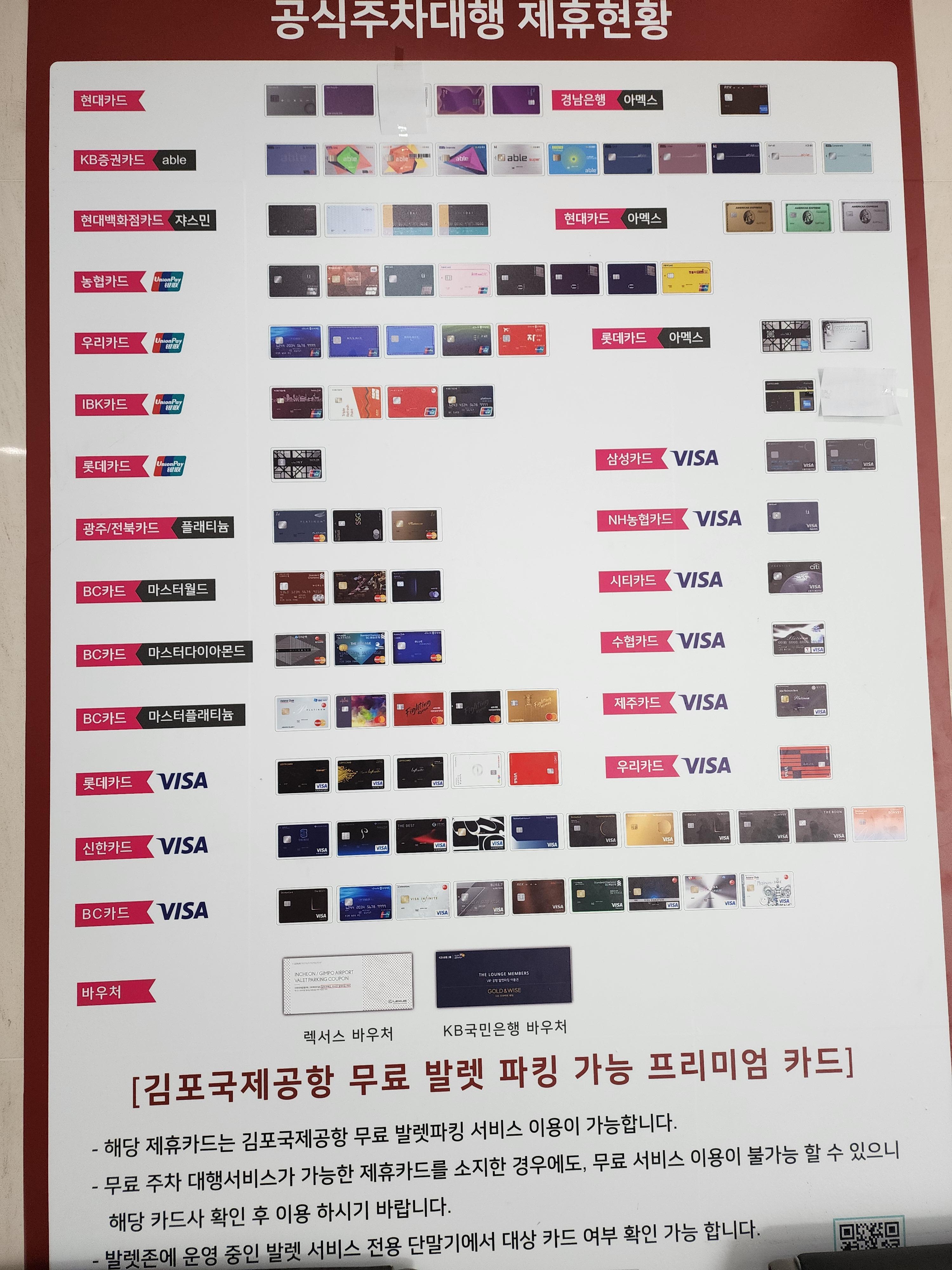 가능한 발렛 카드 사진을 통해 직접 확인하실 수 있습니다. (따로 온라인에는 없더라고요. 사진으로만 확인 가능..) 프리미엄 카드 아니어도 가능한 것 같아요. 농협카드나 신한은행 카드가 제일 많은 듯해요! 사진을 유심히 보시길..