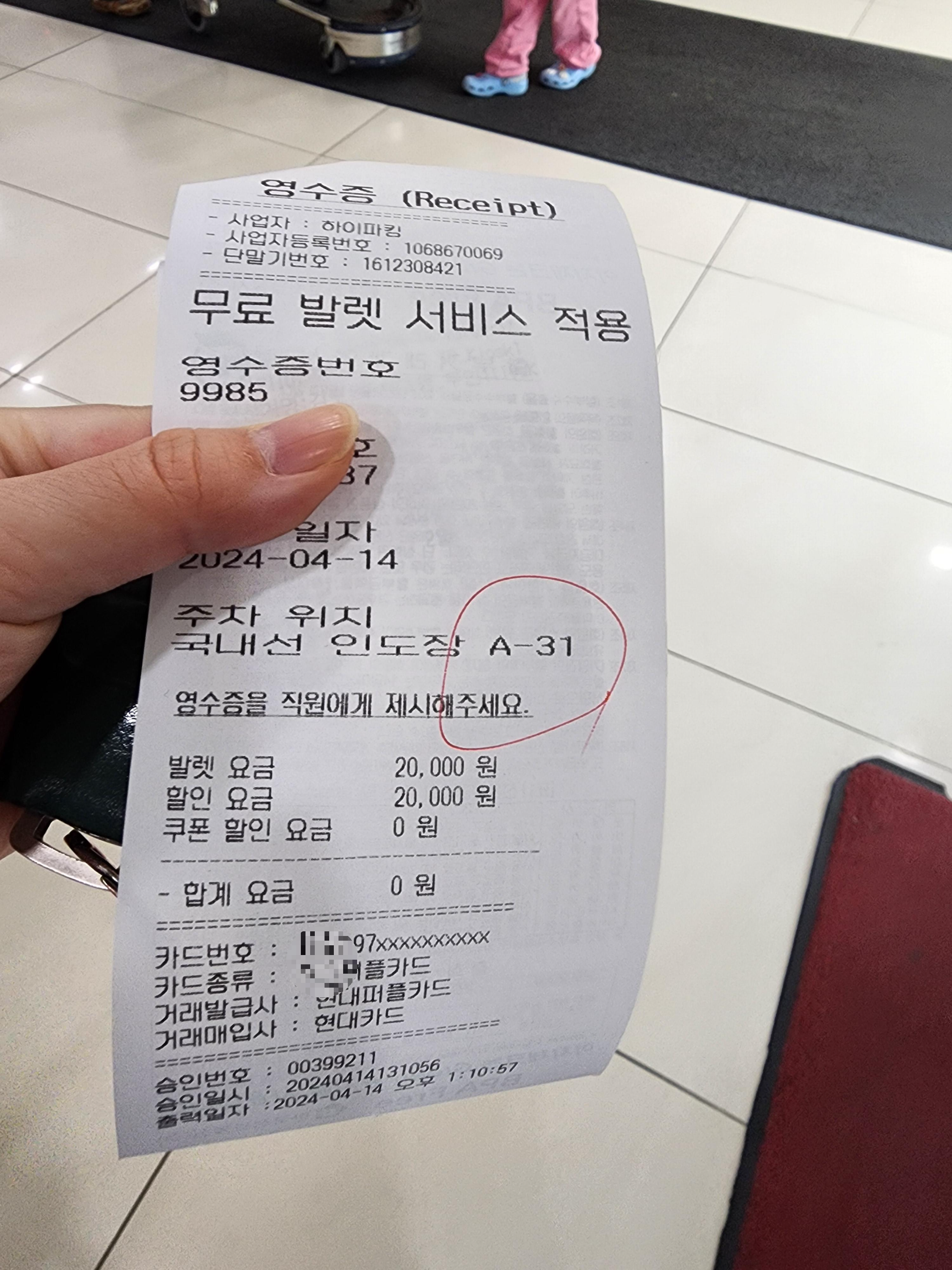 주차는 멀지 않은 곳에 되어 있어요. 차키 찾으면서 같이 알려주세요. 결제 시 제휴카드로 결제한다고 말씀해주시면 되고요. 발렛비는 이렇게 0원으로 결제완료!