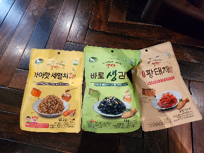 건조반찬 저는 정말 한식 매니아인데요. 부족한 캐리어 공간에 파우치형 제품으로 채우면 KG수도.. 자리도 너~무 부족해서 마지막까지 고민하다가 빼기가 일쑤였어요. 그런 저를 위한 제품.... 건조형 국물, 김자반, 건조반찬!!! 이번에 이렇게 챙겨갔다 다녀왔는데 너무너무 다행스럽게도 잘 먹다 돌아왔어요^^ 다른 햇반이나 참치는 마트에서 바로 구할 수 있는데 이 반찬은 아니니까..!!! 저 같은 한식러버나 아이가 있으시다면, 꼭 가져가보세요.