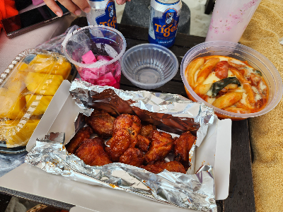 레드윙봉 반마리, 떡볶이 반 주문했는데요. 망고는 서비스로 주셨어요. 풀바에서 타이거맥주만 주문해서 같이 먹었는데 맵찔이인 저도 다 먹을 수 있게 안맵더라고요. 살짝 매콤한 정도!