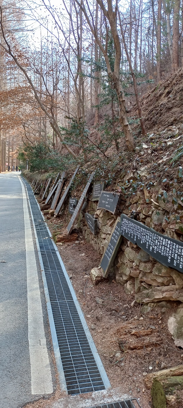 메타세콰이아 나무로 숲을 이룬 산책길 옆 좋은 글들로 방문객의 마음을 사로잡는다