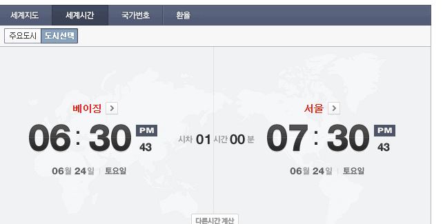 우리나라와의 시차는 1시간이에요. 중국이 1시간 빨라요. 우리가 8시면, 중국은 7시입니다. 엄청 가까운데도 시차가 있는게 신기하네요.
