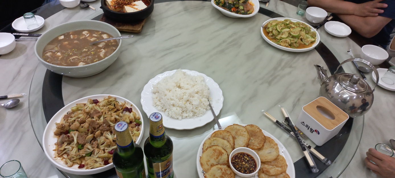 점심 여기에 점심식사 사진을 올리는 것은 중국 현지식이라 걱정하시는 분들을 위해 올린다. 앞으로 연변 식사는 대부분 이런 종류라 우리나라 분들은 별도로 반찬을 가져올 필요가 없을 듯하다. 여기에서 잘 나오는 곳은 김치, 두부조림, 감자조림 등등 추가로 나온다. 상추를 주는 곳도 많아서 한국에서 싸 온 고추장에 쌈 싸 먹어도 괜찮다.