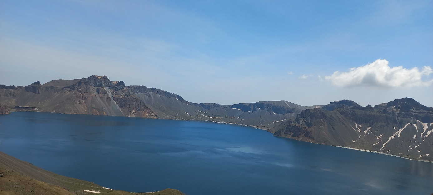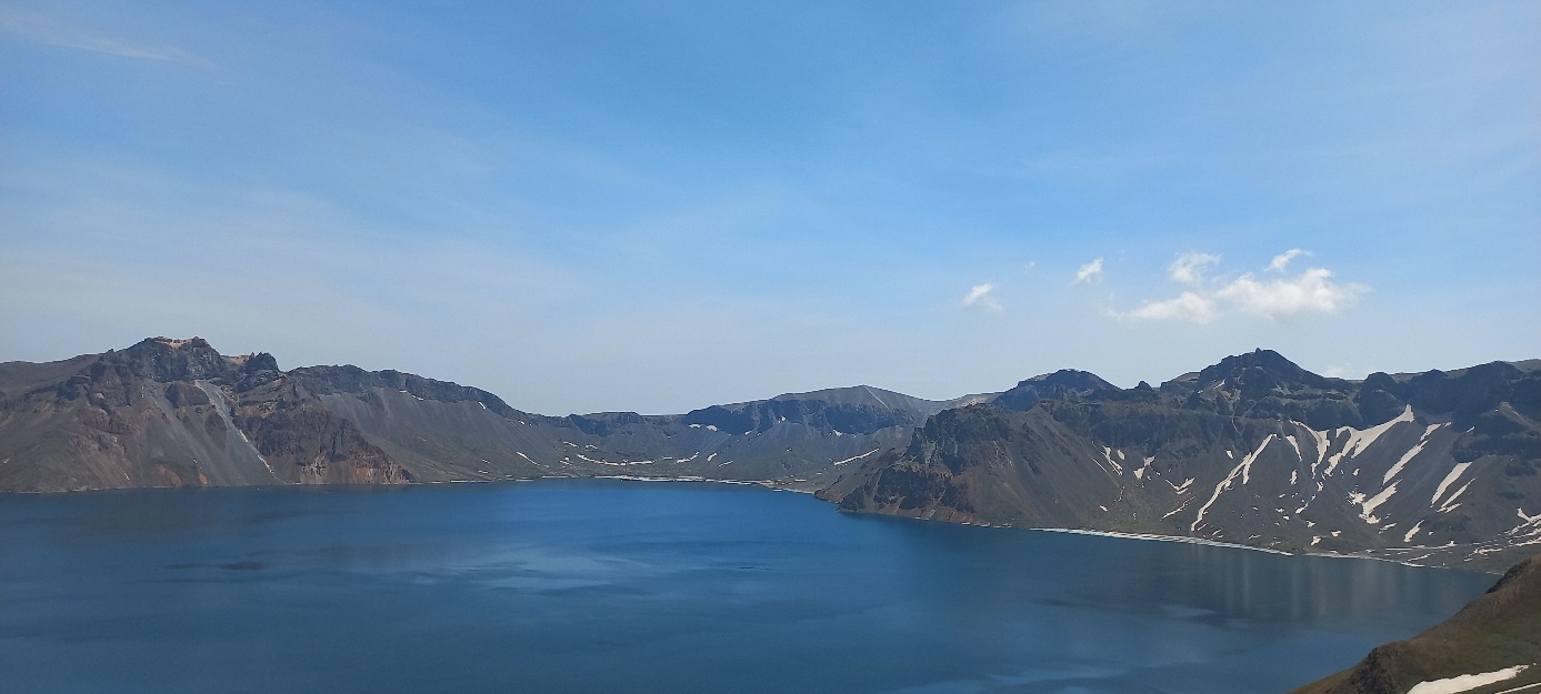 이렇게 날씨 좋은 천지를 보려면 3대가 덕을 쌓아야 한다고 하던데, 우리는 멋진 천지 풍경을 눈에 담았습니다. 클릭하시면 확대됩니다! 천지 최고 깊은 수심은 392m라고 한다.