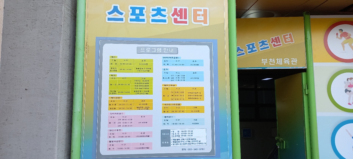 부천 실내 체육관의 1층은 농구 전용 구장이다. 그래서 지하 1층에 탁구장, 헬스장, 요가교실 등이 있다