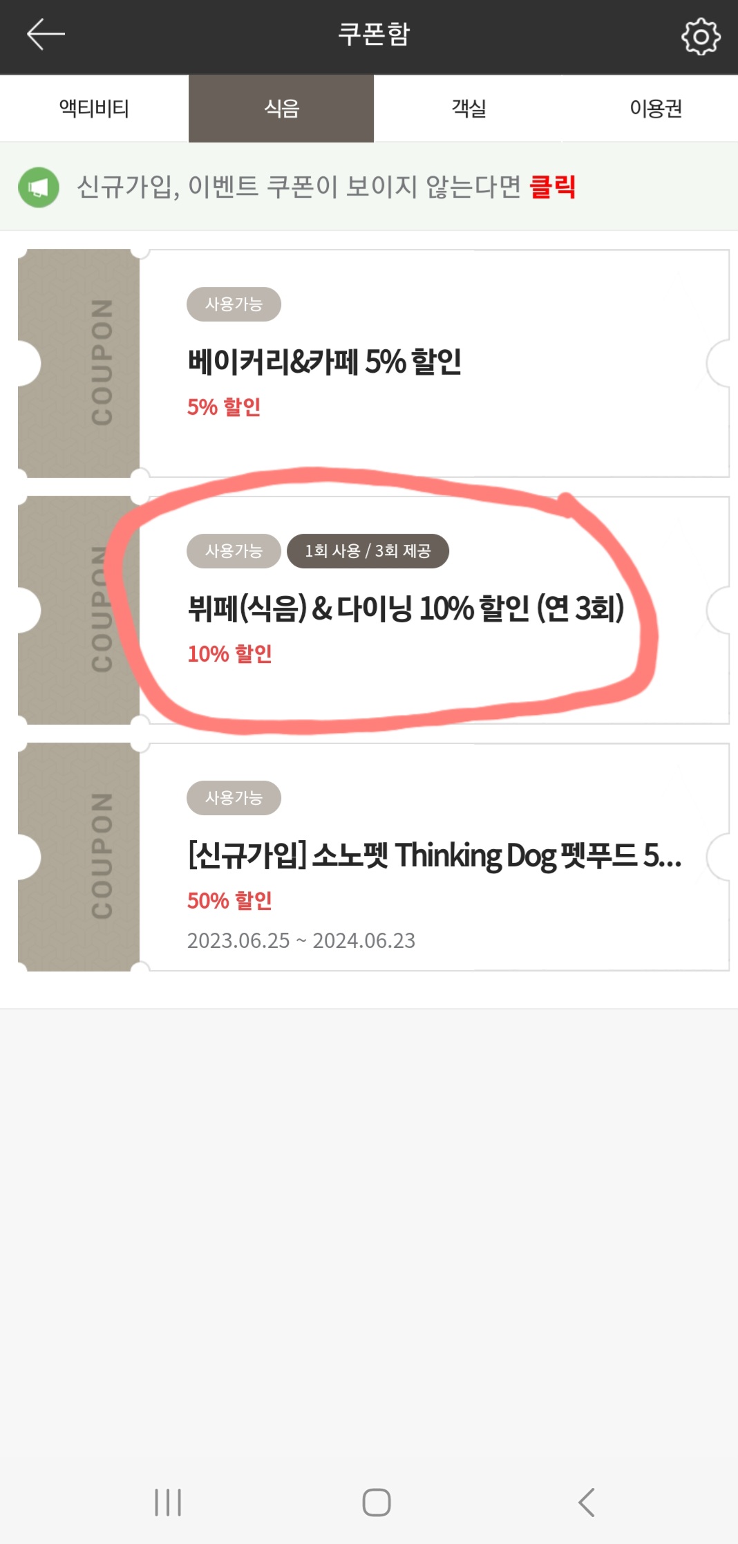 소노호텔앤리조트 어플을 받아서 D멤버스 가입하시면 쿠폰-식음 쪽에 10% 할인 쿠폰이 들어와있어요. 6명이 이용할 거라 6명 전부 가입해서 적용했습니다.