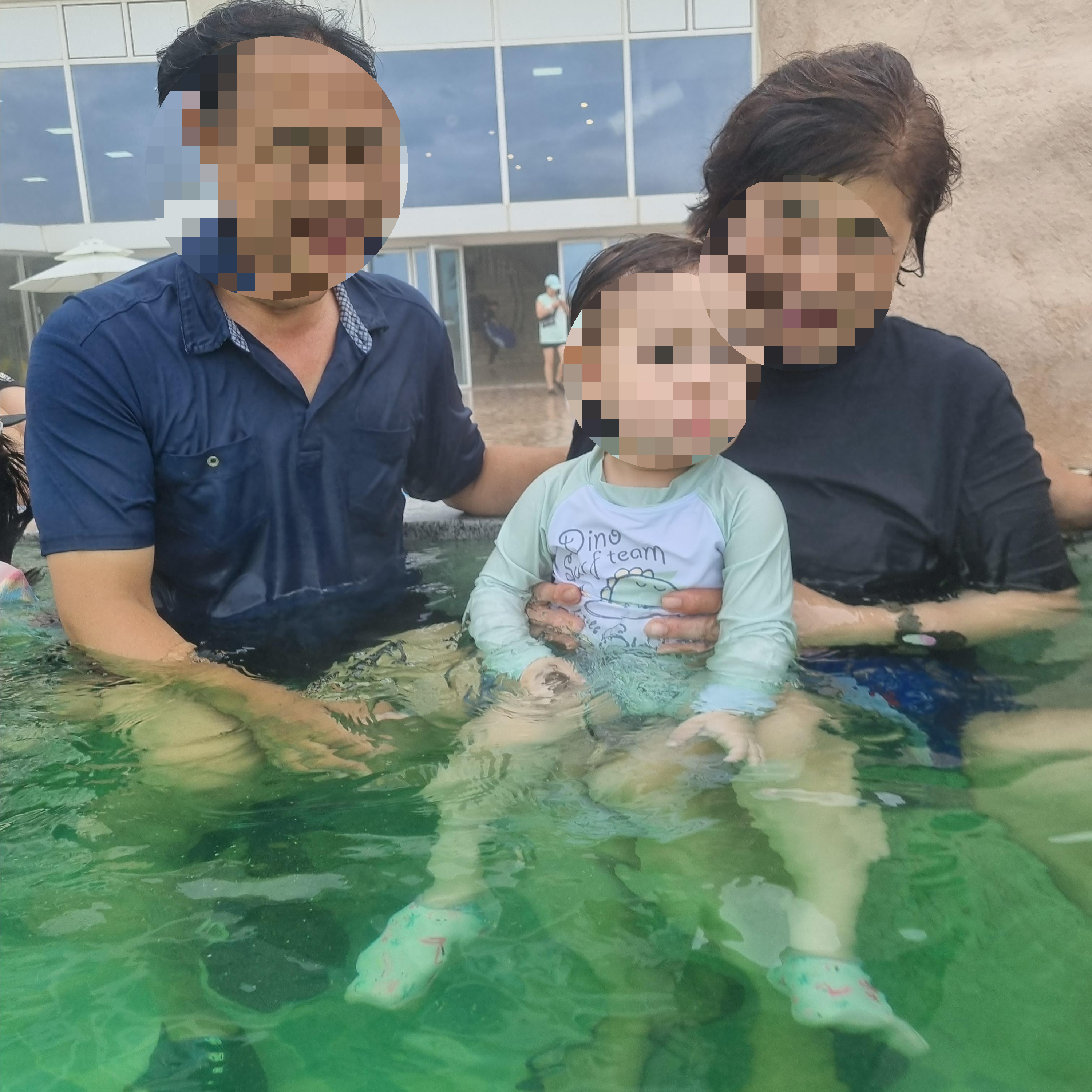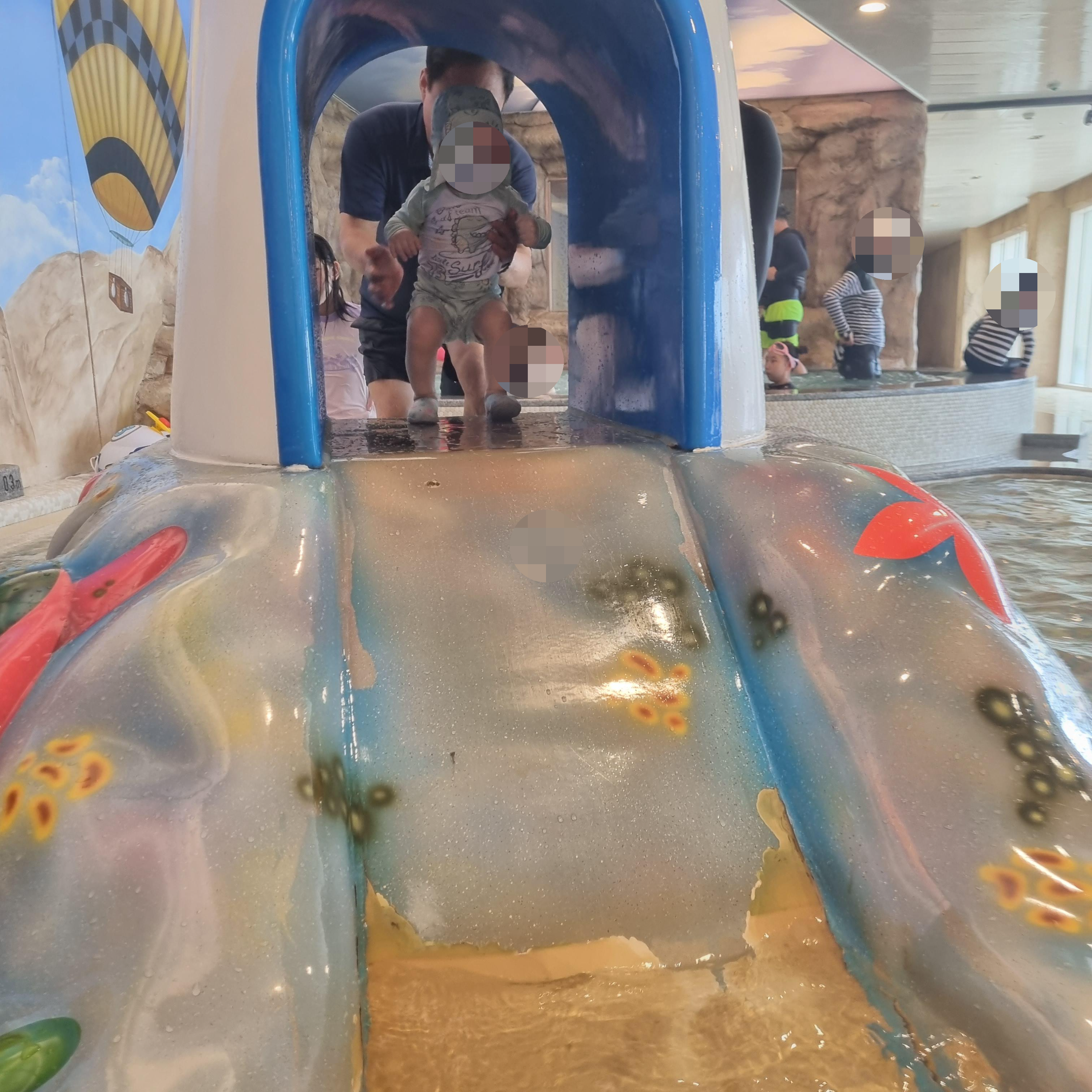 키즈풀에서 미끄럼틀을 태워줬는데 무서워하지도 않고 잘 타더라고요! 살짝 물에 몸통만 잠겨서 아기도 너무 재밌게 놀았던 미끄럼틀이에요. 역시 쏠비치!