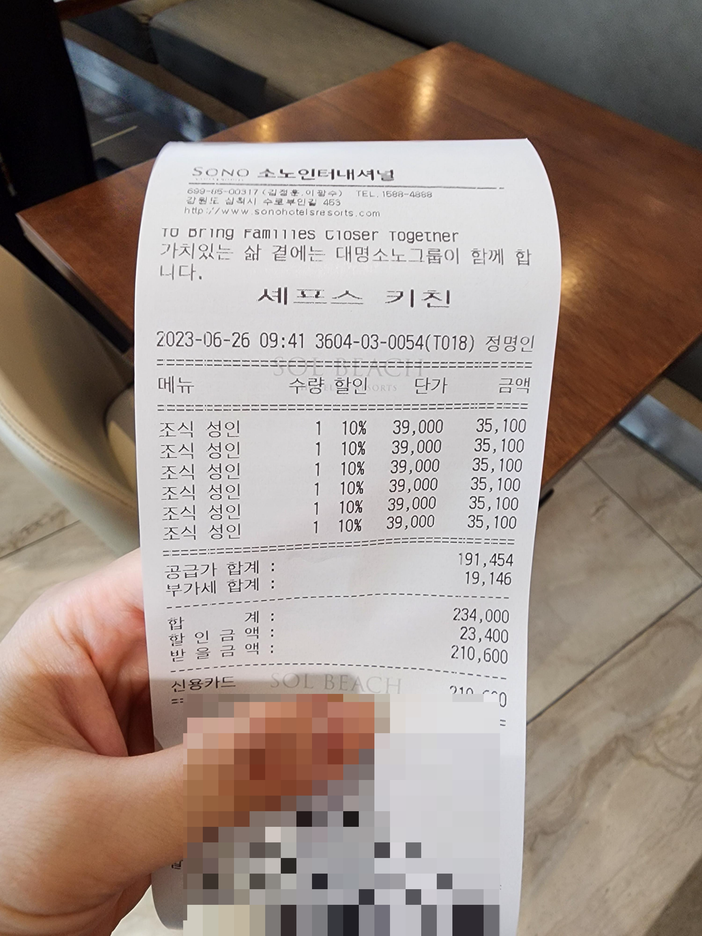 소노호텔앤리조트 어플을 받아서 D멤버스 가입하시면 쿠폰-식음 쪽에 10% 할인 쿠폰이 들어와있어요. 6명이 이용할 거라 6명 전부 가입해서 적용했습니다.