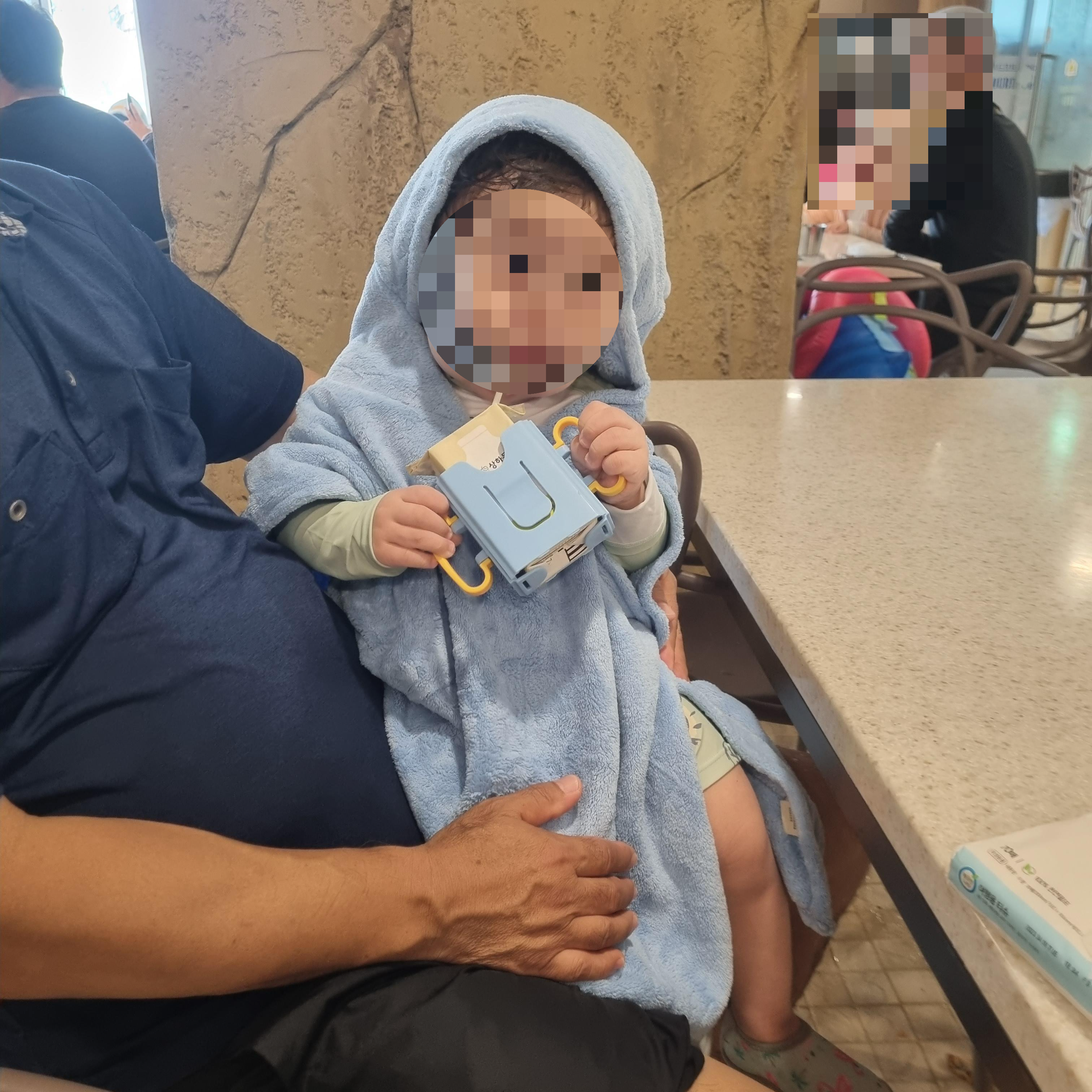 조카는 멸균우유 챙겨온 걸 먹였고요. 따로 이유식 먹여줬어요. 유아의자가 있긴한데 할아버지 품이 더 좋았던 조카..!