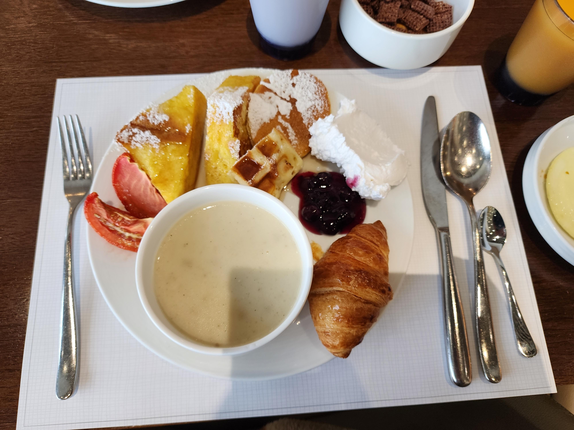 저의 조식 첫 접시. 프렌치 토스트와 팬케익, 와플, 크루아상 담아왔어요. 스프도 빠질 수 없고요!