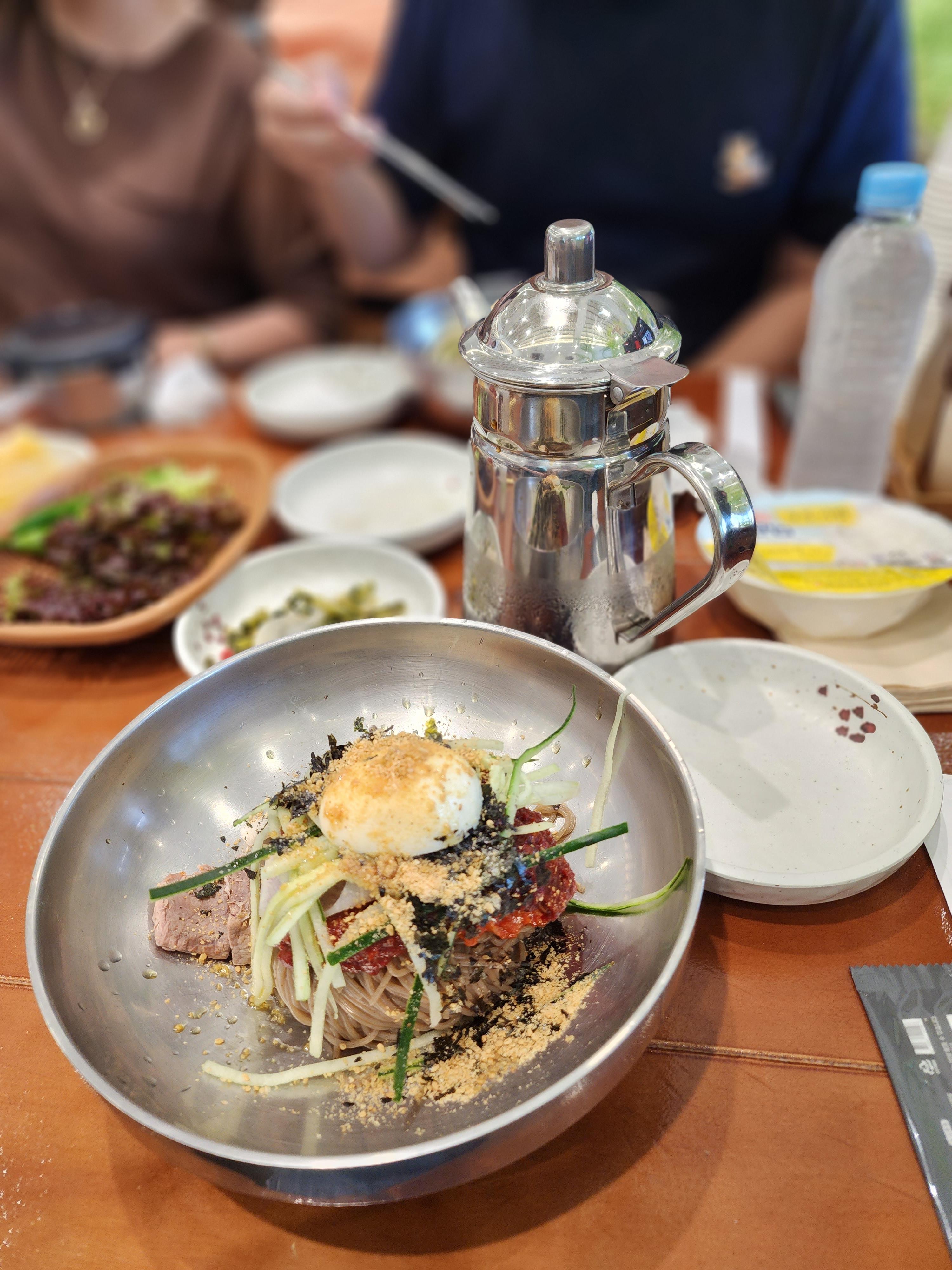 비빔막국수는 이렇게 냉육수 주전자를 같이 주셔서요. 중간에 냉육수도 많이 부어 먹었어요! 비빔과 물을 동시에 즐길 수 있었어요~!
