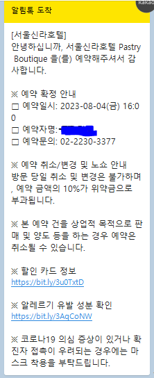 신라호텔은 네이버 예약이 불가능하고 전화로만 예약이 가능합니다! (롯데호텔이나 웨스틴조선은 네이버로 포장예약가능함!) 저는 약간 전화 울렁증이 있는데 꾹 참고 전화해보았습니다... 예약완료 시 아래와 같은 카톡이 옵니다.