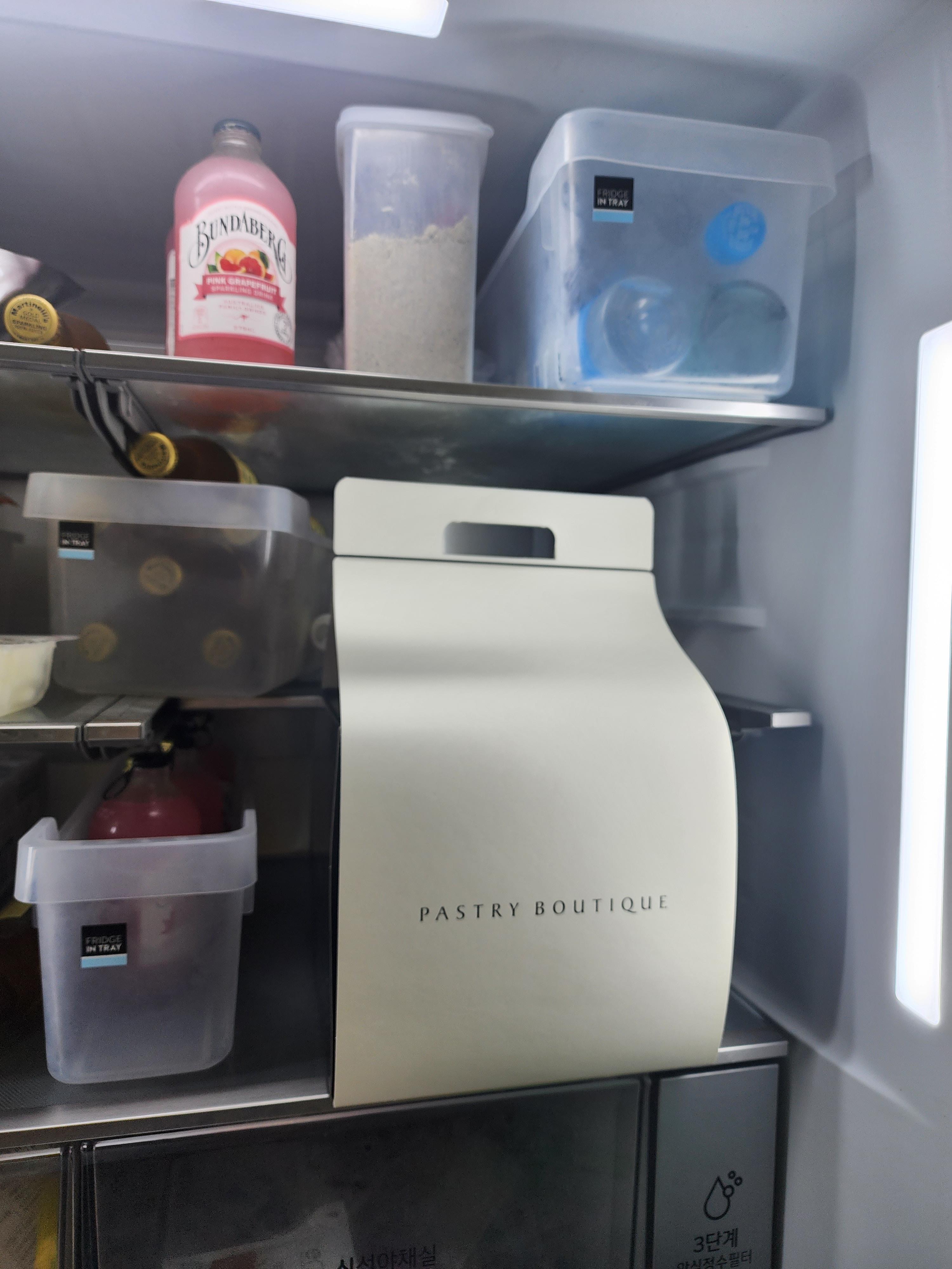 생신 전날이라 케이크는 냉장고 한켠에 넣어두었습니다.. 오브제 냉장고인데 한쪽 받침대를 접으니까 들어가더라고요! 사이즈 고려하시라고 사진 첨부해드립니다~!