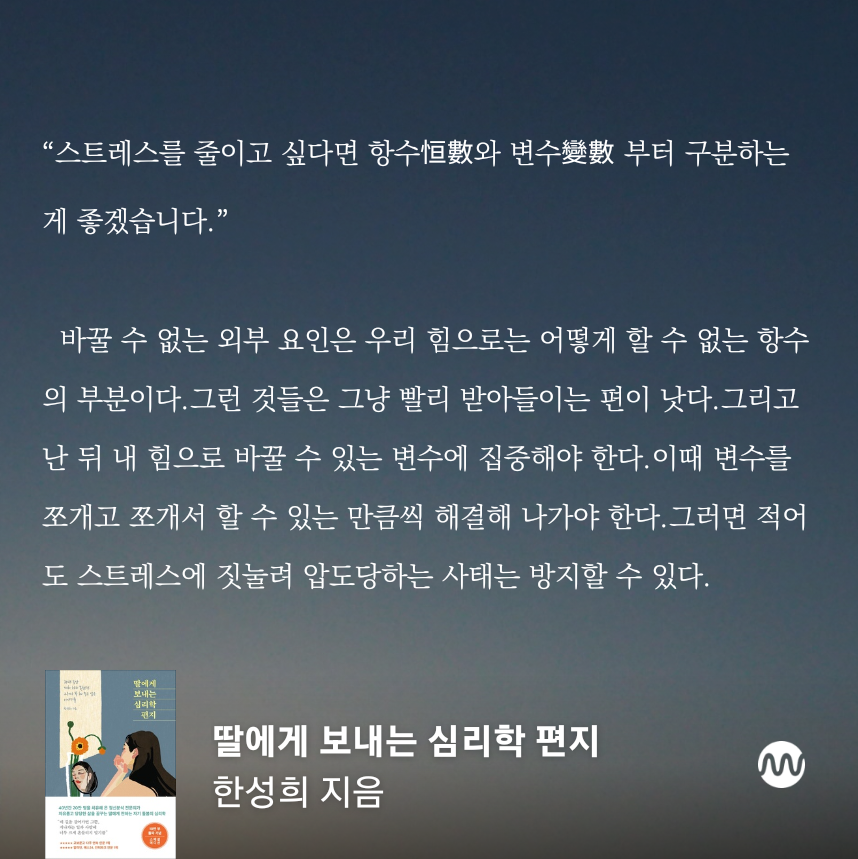 내가 스트레스를 받는게 혹시 항수 때문이라면 받아들이고, 변수 때문이라면 해결할 수 있기 때문에 항수와 변수의 구분은 중요하다해요.