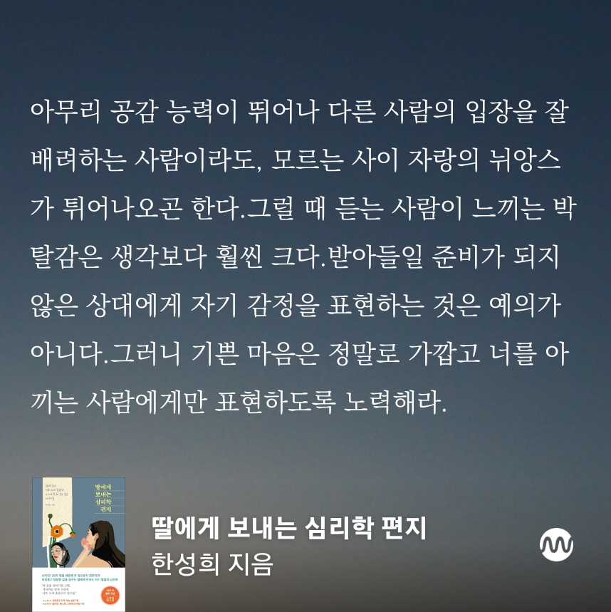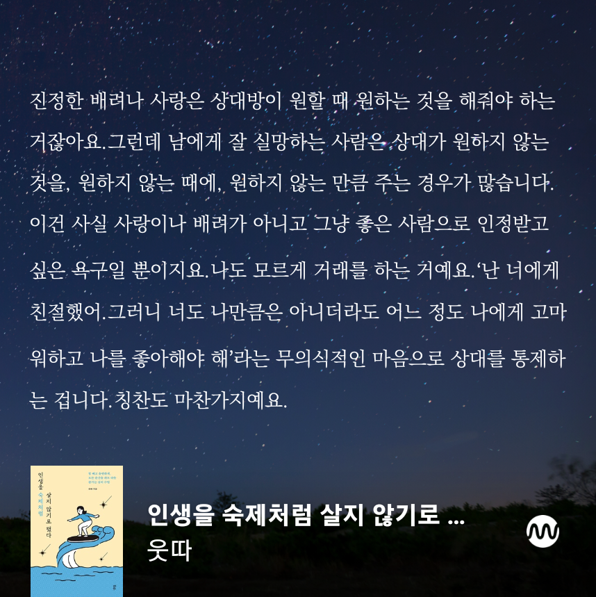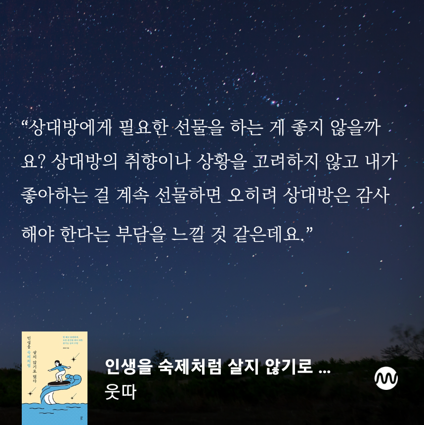 타인에게 진짜 필요한지 아닌지 맞춰보자는 마음으로 선물했었는데요. 저는 이 구절을 읽고 머리를 맞은 것 같더라고요. 선물 받고도/해주고도 묘한 불편함의 이유를 알게되어서 속이 시원했어요.
