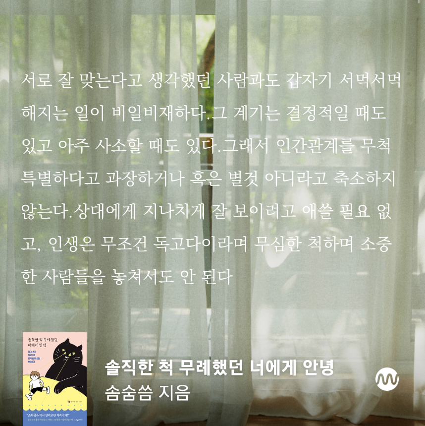 그때 그때 내 상황에 따라 자주 만나게 되는 사람이 달라지게 되더라고요. 나도 그러니까 타인에게 너무 서운해하지 말고요.