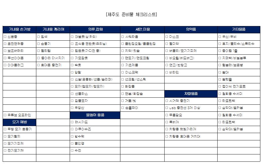 보부상의 체크리스트지만 워터파크 가시는 분들도 유용하게 쓰실 수 있으실거에요. 렌트카는 차량용품이 없어서 챙기는 것도 잊지 마시고요. 저는 전부 유용하게 사용해서 이번 여행에서도 불편함이 없었어요. 이정도 양이면 기내용 2개에 충분히 들어가더라고요. 2박 3일 여행 뭘 챙겨야 할지 막막하시다면 이 글 꼭 참고해보세요!