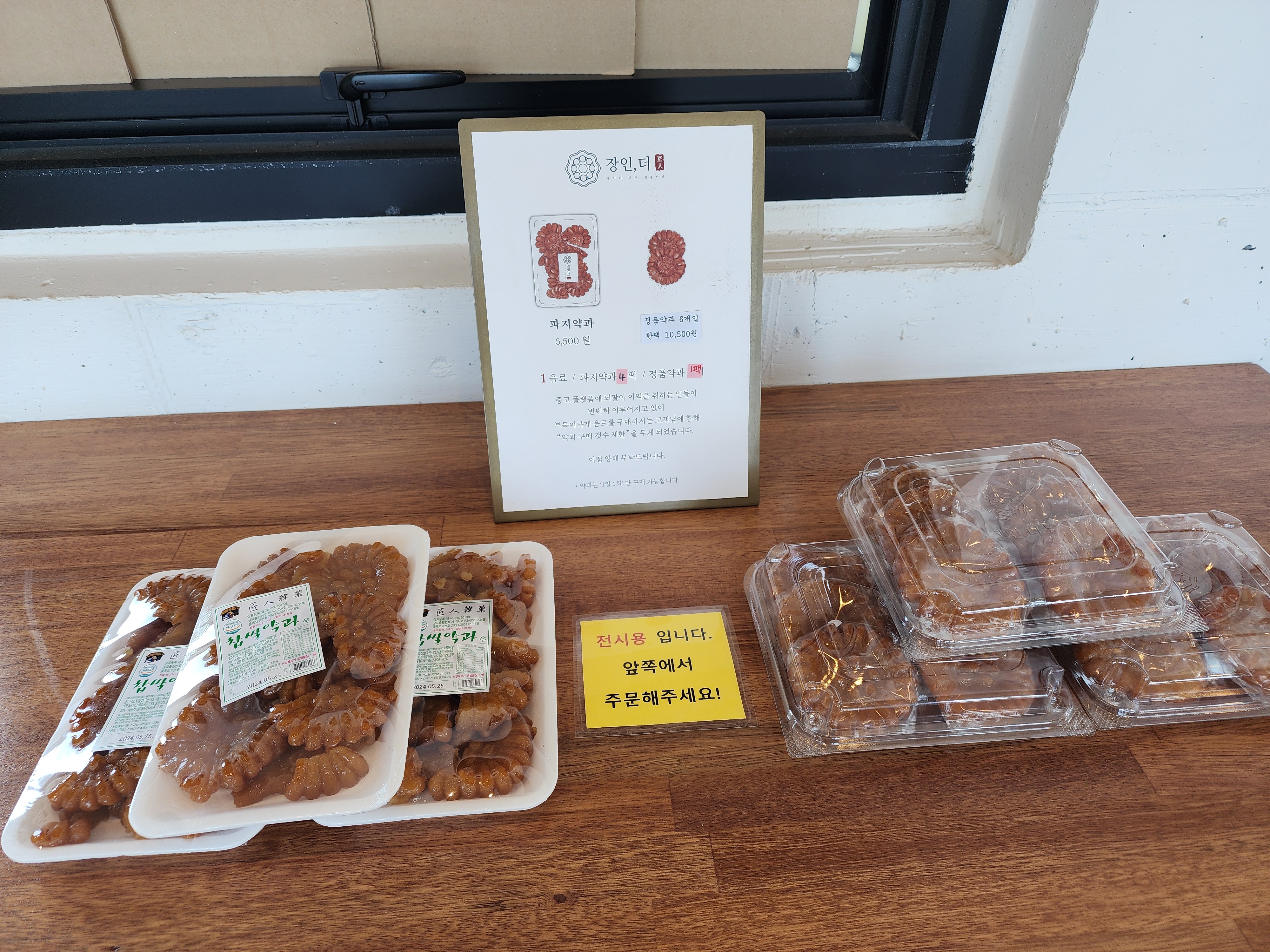 장인약과랑 런던베이글 뮤지엄은 엄청 가깝게 붙어있어요. 근데 예약없이 간 런베뮤에서 포장인데도 1시간을 기다리라고 해서 포기했고요.. 바로 장인약과로 갔는데 여기는 평일이라 그런지 사람 0명! 너무 좋았어요.