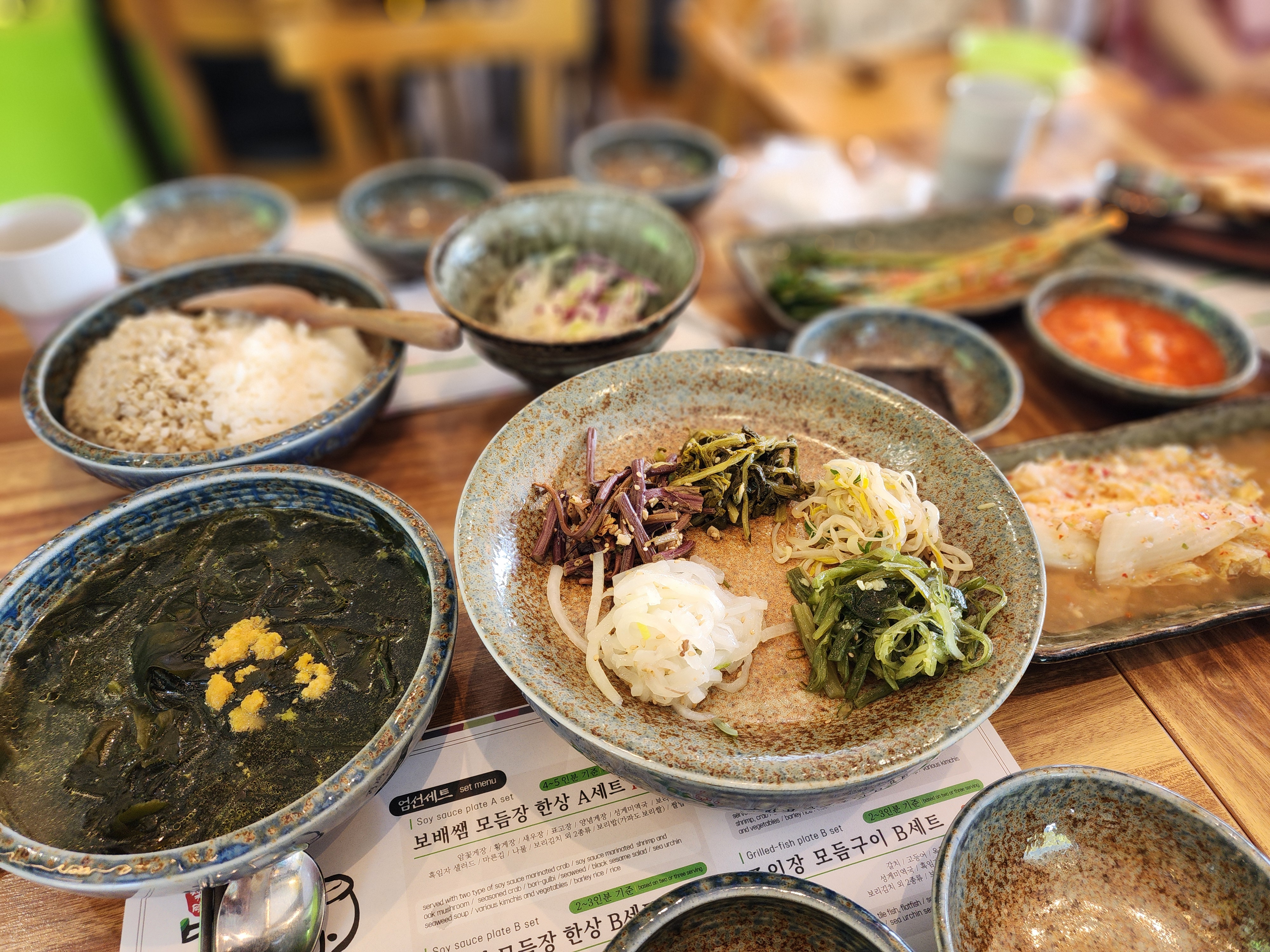보리밥과 쌀밥을 반씩 주시고요. 나물을 비벼먹을 수 있게 고추장과 참기름, 그릇 함께 나왔어요. 성게미역국도 덜어먹을 수 있고요. 메인인 보리김치도 보이네요. 가자미 구이는 아기도 먹을 수 있게 나와서 좋았어요.
