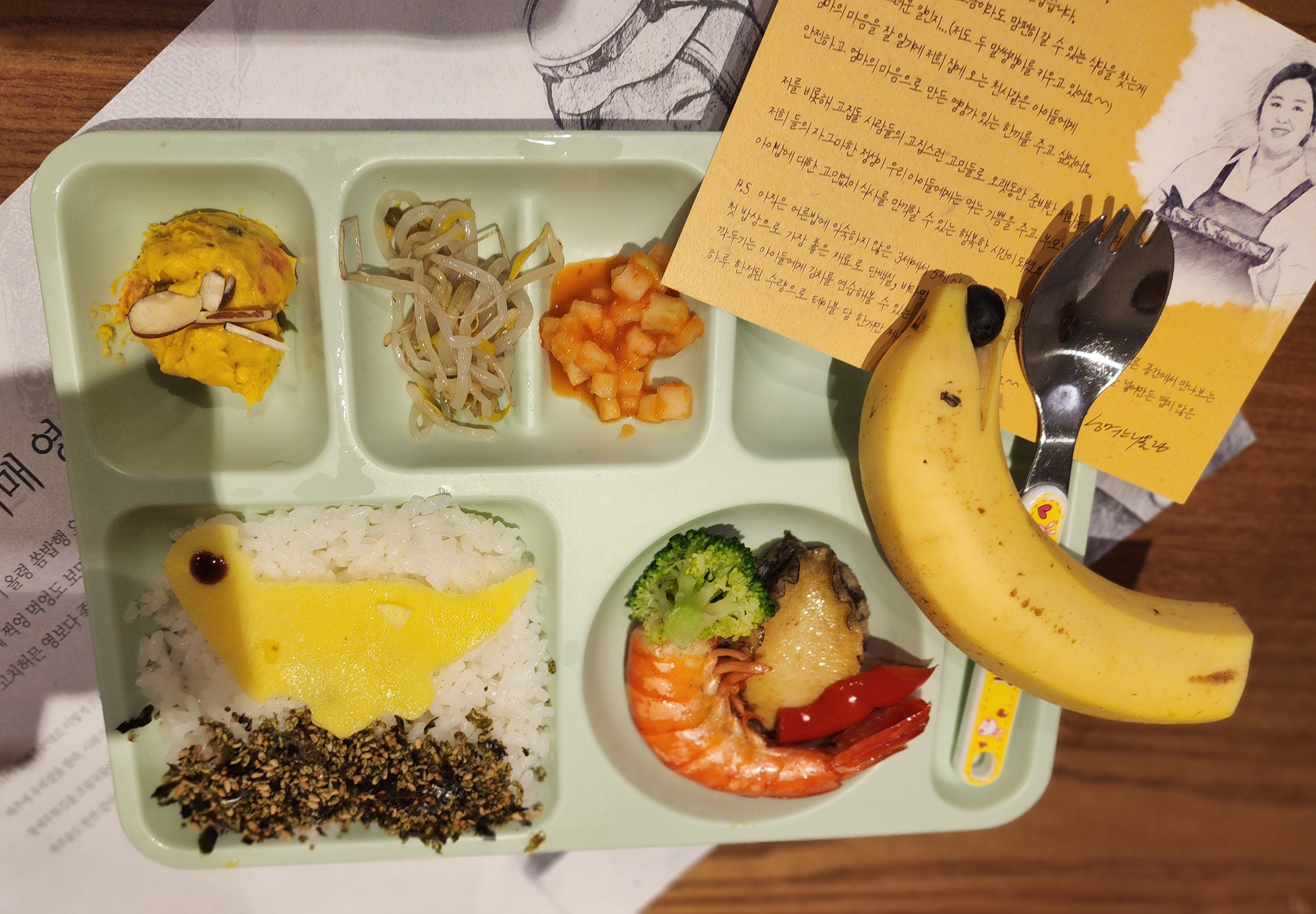 아기가 오면 이렇게 아기밥을 서비스로 주세요. 공룡 계란지단이나 돌고래 바나나도 넘 귀엽고요. 공짜인것 치고 퀄리티가 엄청나요. 새우와 전복도 쪄주시고요! 깍뚜기는 파프리카요!