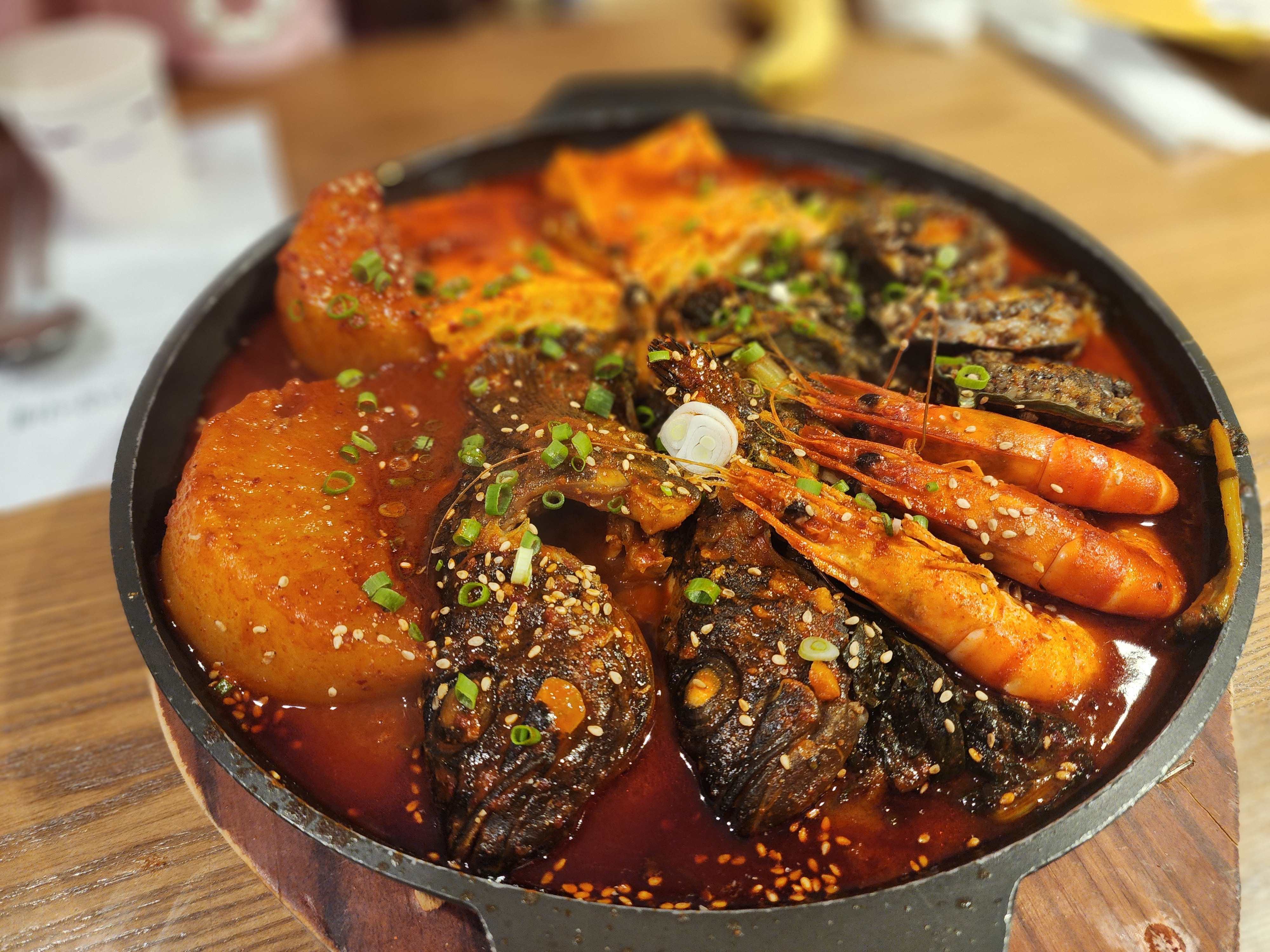 메인 우럭조림. 안에 새우, 전복, 무, 두부, 우거지가 들어있어요. 밥에 쓱쓱 비벼먹으면 너무 맛있엉..