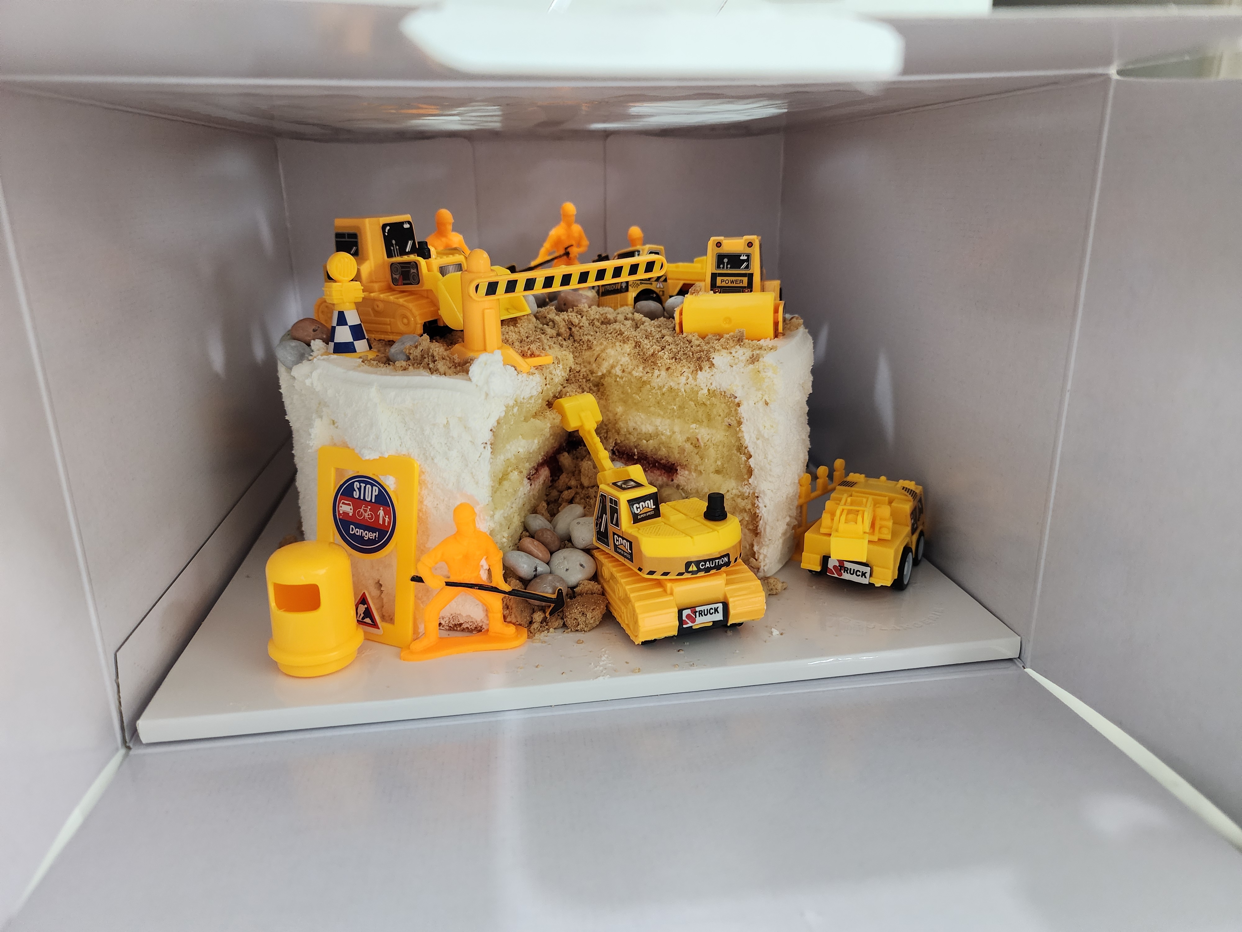 "우와~ 진짜 공사장 같아!!"라며 신나서 장난감을 바로 움직이더라고요. 😆 케이크는 먹기도 전에 이미 놀이 공간이 됐답니다.