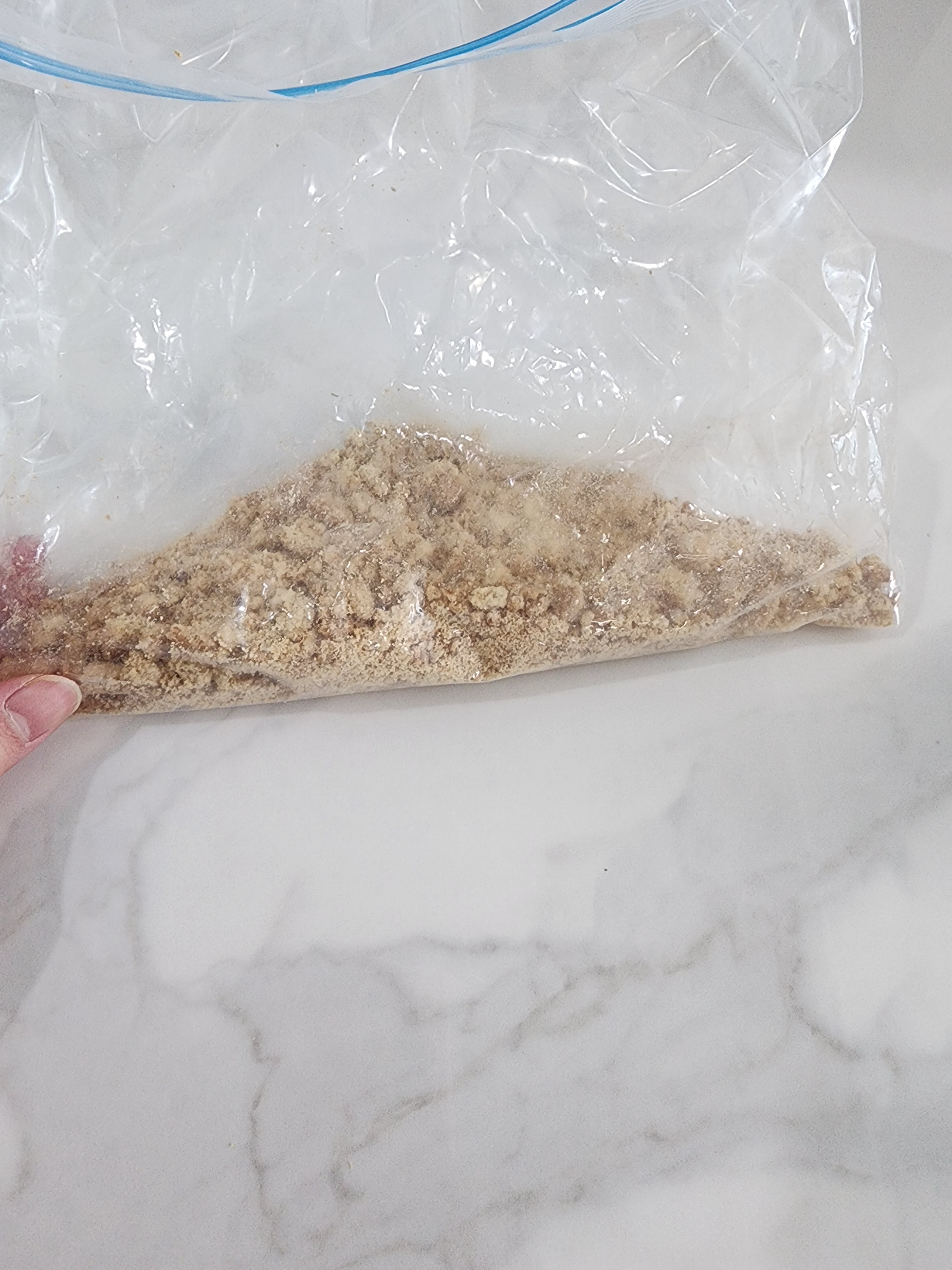 3️⃣ 쿠키로 흙 표현하기: 다이제 곡물맛을 비닐봉지에 넣고 손으로 부숴주세요. 아이가 이 작업을 도와주면 정말 좋아할 거예요. 🥰 이 쿠키가 흙 역할을 하게 됩니다. 거기에 석기시대 초콜릿 흩뿌려서 돌멩이 느낌 살려주세요.