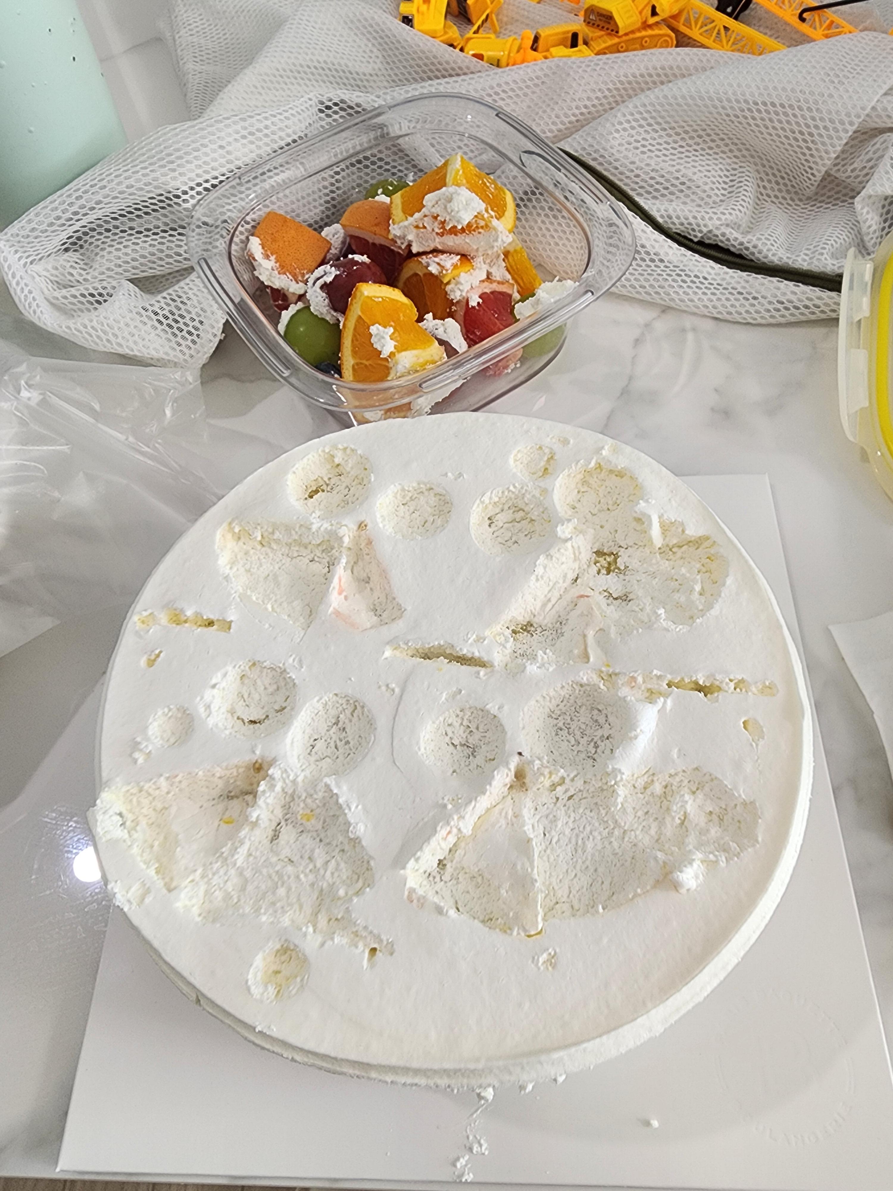 2️⃣ 케이크 정리하기: 생크림 케이크 위에 있던 장식을 걷어내고요. 케이크 한조각 잘라서 단면이 보이게 해줍니다. 맨 아래 시트는 남겨서 층 지게 해주면 더 리얼하더라고요~!