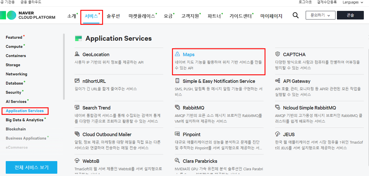 서비스 - 어플리케이션 서비스 - 맵 을 순서대로 누르면 됩니다.