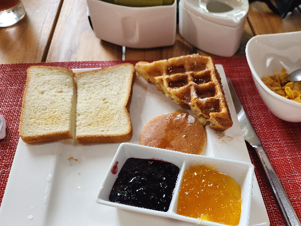 제가 가장 좋아하는 조합인데요. 집에서도 종종 해먹어요. 집에서는 전부 올리고 한번 에어프라이어에 굽는데요. 호텔에서 그런 짓 하면 민폐니까 그냥 올려서만 먹어보았어요... 다양한 잼에 올려서 매일 다양한 맛을 즐겨보았습니다.