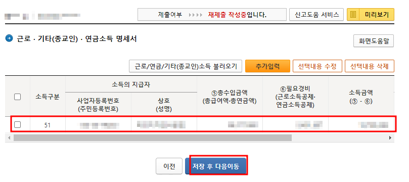 아래 금액이 잘 들어온 걸 확인하고 저장 후 다음이동 버튼을 눌러줍니다. 여기까지가 프리랜서 소득을 불러오는 작업이었고요. (대리운전, 배달 등등)