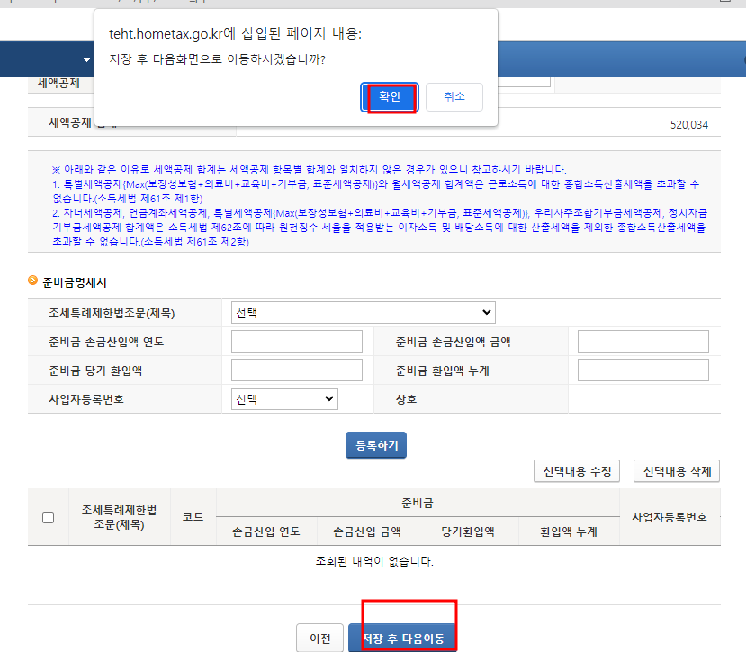 결손금은 있는 분들 거의 없으니까요. 그대로 확인 버튼 눌러줍니다.