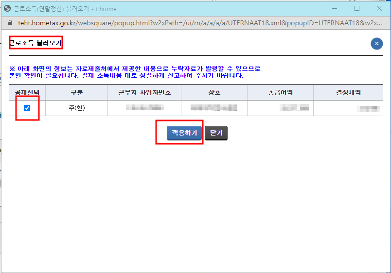 팝업이 뜨면 파란 체크 후 적용하기 버튼을 눌러줍니다. 이건 회사에서 한 연말정산을 그대로 불러오는 작업이에요.