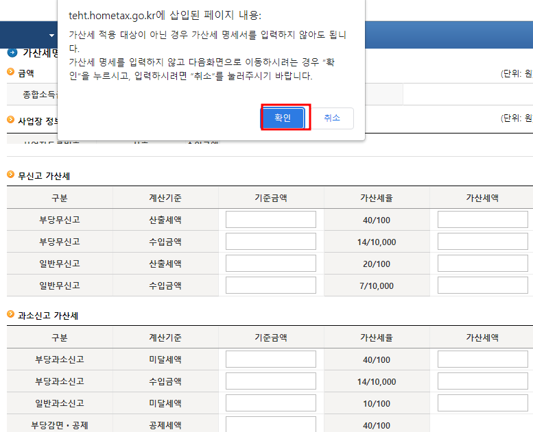 지금은 정기신고 기한 내 라서 가산세가 없어요. 이건 나중에 신고기한을 놓쳐서 기한후 신고하실때 작성하는 탭이라서요. 확인 후 넘어갑니다.