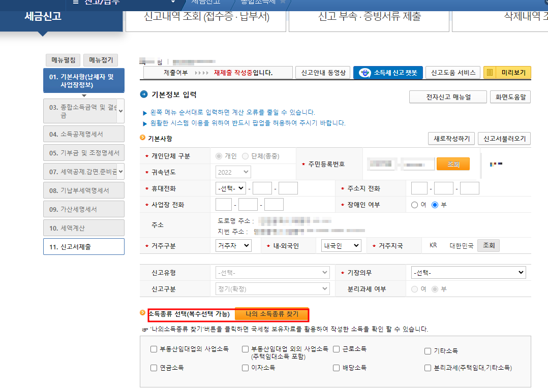 맨 아래 빨간 네모 인, 나의 소득종류 찾기를 눌러주세요.
