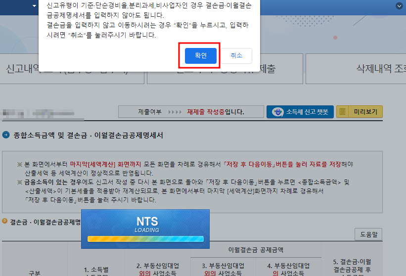 결손금은 있는 분들 거의 없으니까요. 그대로 확인 버튼 눌러줍니다.