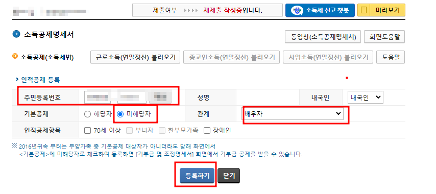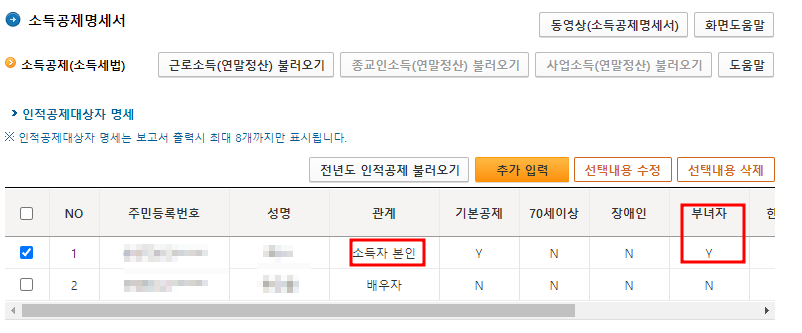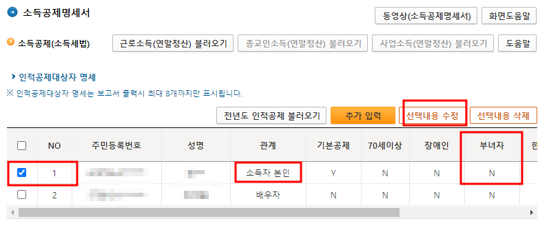 배우자 주민등록번호가 입력되었으니까 이제 부녀자 N 이라고 되어있는걸 Y로 고칠거에요.