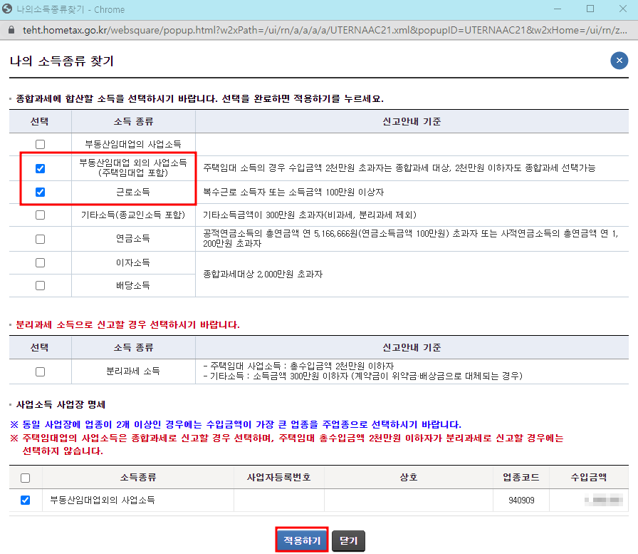 국세청에 제출된 지급명세서 대로 자동으로 불러오네요. 근로소득과 사업소득이 이미 눌려있어요. 그대로 적용하기 버튼을 눌러줍니다.