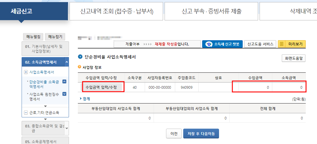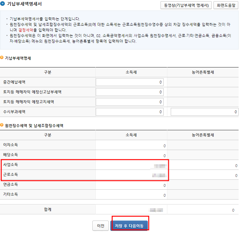 팝업이 꺼지고 명세서에 금액이 제대로 들어왔는지 보고 다시 저장 후 다음이동 버튼을 눌러줍니다.