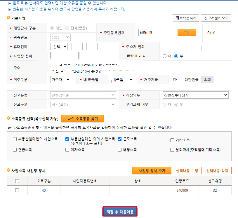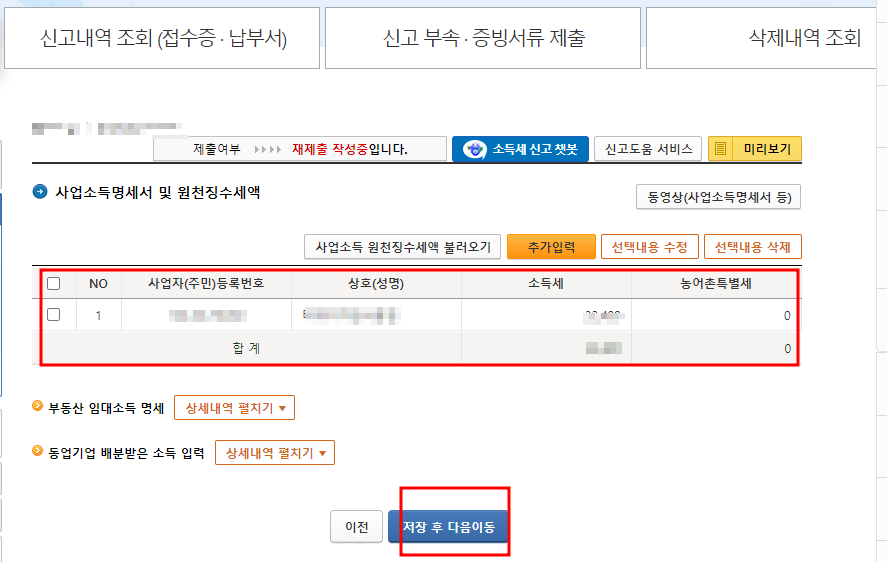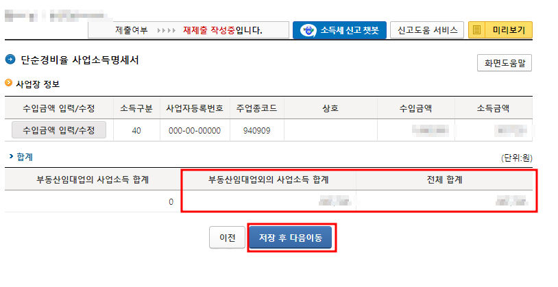아래 금액이 잘 들어온 걸 확인하고 저장 후 다음이동 버튼을 눌러줍니다. 여기까지가 프리랜서 소득을 불러오는 작업이었고요. (대리운전, 배달 등등)
