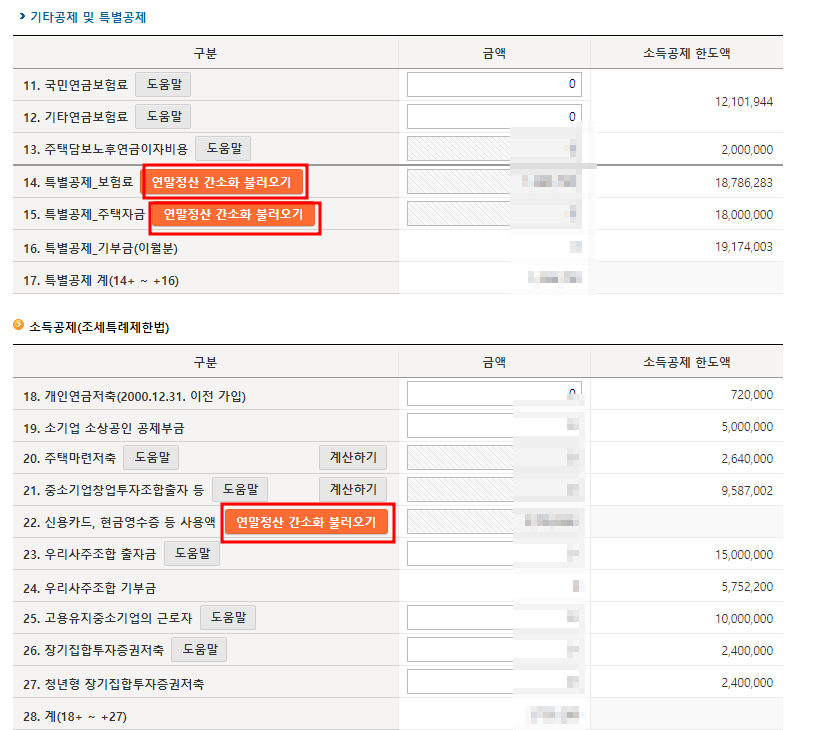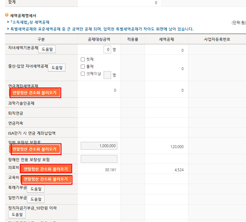 이제 여기에도 연말정산 간소화불러오기 버튼이 보이는데요. 전부 다시 불러와줍니다. 추가적으로 누락된게 있다면 입력해줍니다. 보통 의료비나 교육비를 누락시키니까 이 부분 잘 체크해보세요!