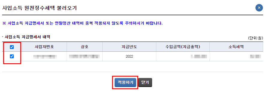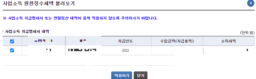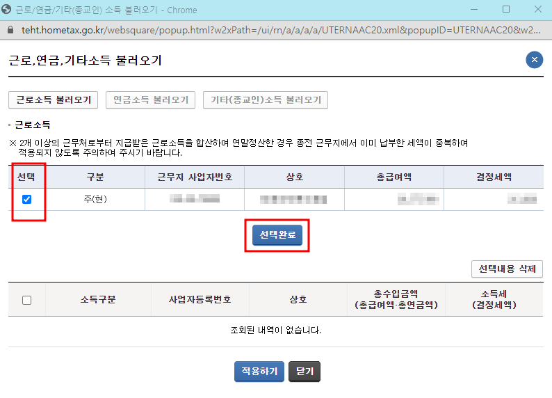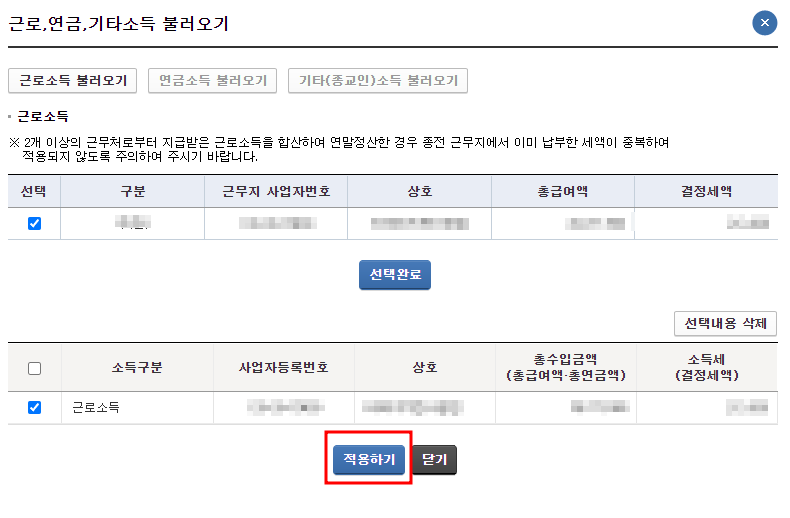 팝업이 뜨면 파란 체크 후 적용하기 버튼을 눌러줍니다. 이건 회사에서 한 연말정산을 그대로 불러오는 작업이에요.