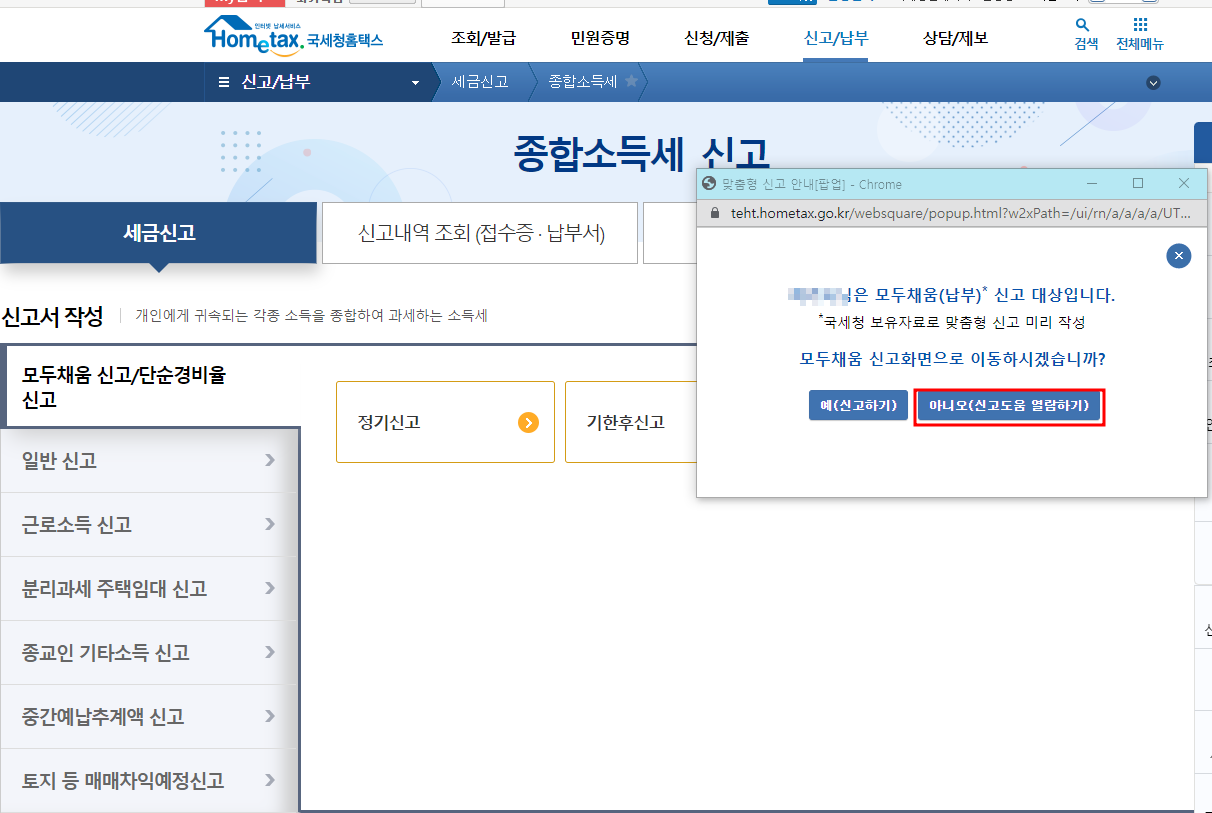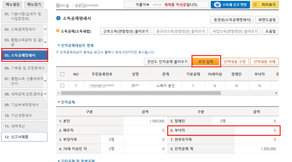홈택스 모두채움으로 하면 "부녀자공제"가 안들어가더라고요. 그 외에도 연말정산 수정할 부분이 있어서 모두채움 말고 일반신고-정기신고 를 작성해서 신고해볼게요.