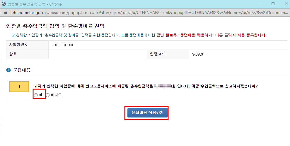 팝업에서 예를 체크해서 문답내용 적용하기 버튼을 눌러보세요.