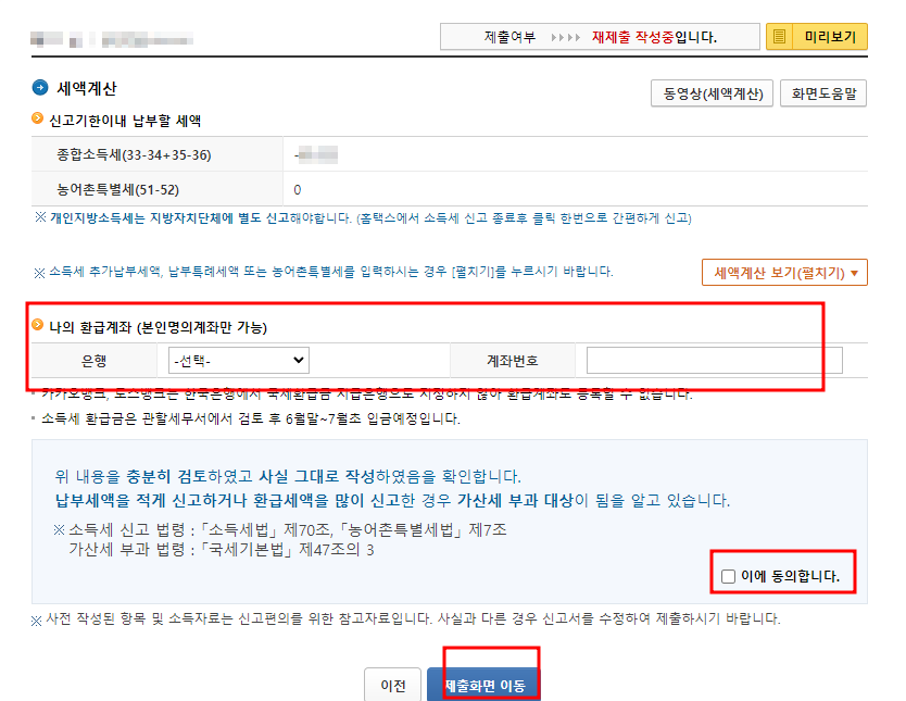 나의 환급계좌에 계좌번호를 넣어주고 아래 동의 체크 한 후 제출하세요!