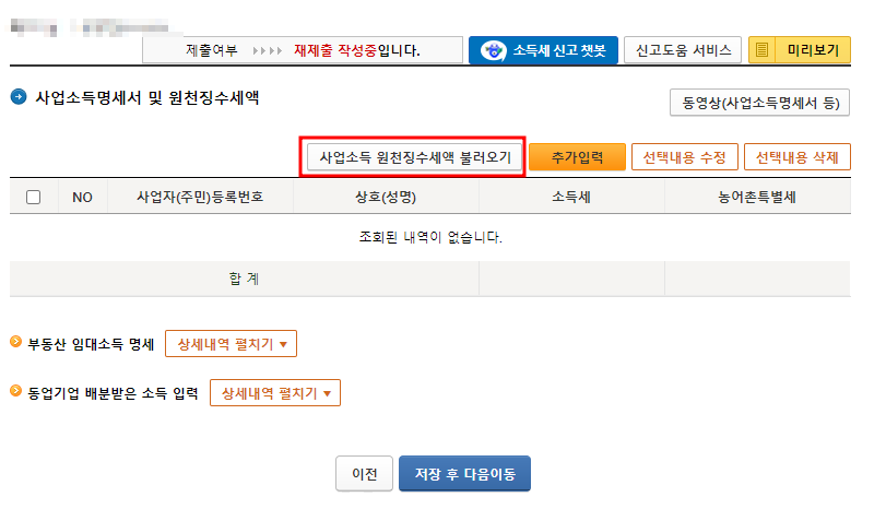 사업소득 원천징수세액 불러오기 버튼을 눌러주세요.